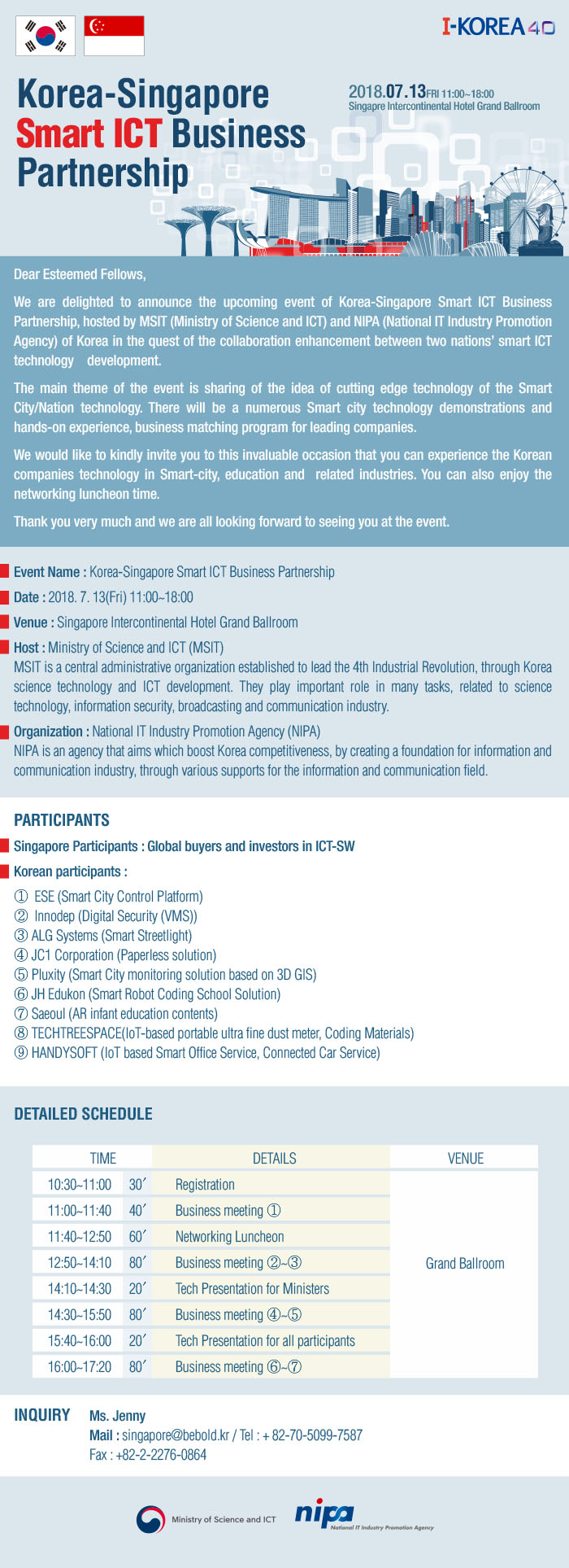 한국과학기술정보통신부 주최 Korea-Singapore Smart ICT Business Partnership 행사 참가신청 안내 페이스북 트위터 작성일: 2018-07-10 작성자: 최고관리자 조회수: 900 참가신청방법 : 첨부 파일을 다운로드하여 참가 신청서 작성 후 아래 메일로 신청서 발송 E-MAIL : singapore@bebold.kr 첨부파일 singapore_edm image.jpg [NIPA] Invitation Letter_0703.pdf [NIPA]Korea-Singapore Smart ICT Business Partnership registration form.pdf
