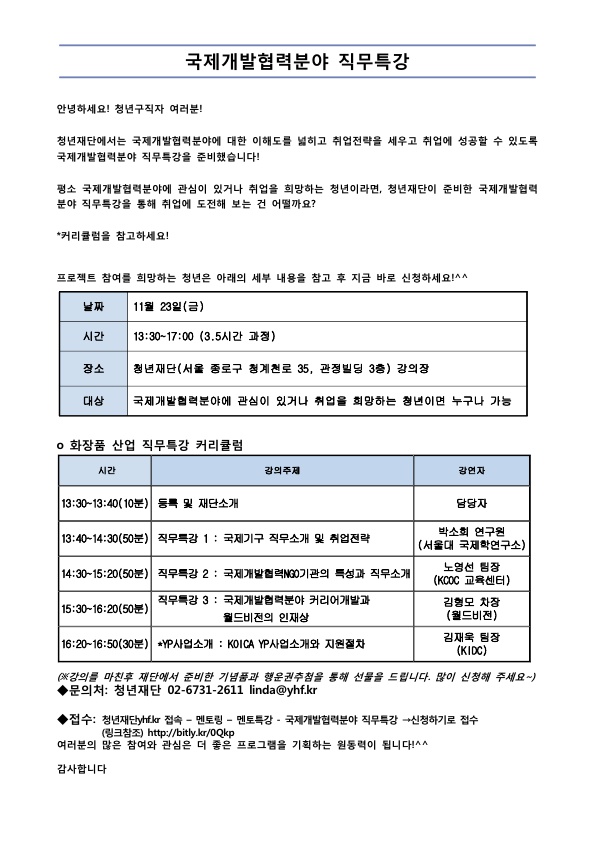 국제개발협력분야 직무특강 안내 페이스북 트위터 작성일: 2018-11-08 작성자: 최고관리자 조회수: 1071 첨부파일 0A5248C1B337BC6FC0F1C081D9B24110_1.jpg