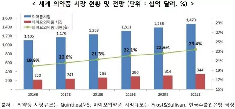 케미컬(화학 의약품) 위주 제약과 바이오(생명공학)는 모두 약품 기반의 핼스케어산업이다. 이를 통털어 의약품이라 칭한다. 전체 의약품 시장 규모는 2016년 1조1050억달러에서 2021년 1조4700억달러로 예상된다. 바이오의약품 시장규모는 2016년~2021년 사이에 연평균 9%씩 성장하여 2016년 2220억달러(전체의약품의 20%)에서 2021년 3440억달러(전체의약품의 23%)로 예상된다. 특히 전체의약품 매출 상위 100대 품목 중에서 바이오의약품 비중을 살펴보면 2008년 30%, 2015년 47%, 2022년에는 50%이상이 될 것으로 예상된다. 2016년 기준 국내 바이오의약품 시장 규모는 1조8천억으로 국내 전체 의약품 시장의 약 10%를 차지한다. 바이오의약품 수출 실적은 연평균 29.8% 고속 성장을 유지하고 있다.
