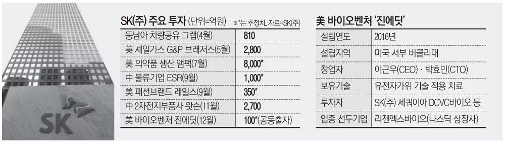 SK(주)는 유전자가위 기술인 크리스퍼 카스9(CRISPER/Cas9) 적용 치료제를 효과적으로 체내에 전달하는 기술을 개발하는 미국 진에딧(GenEdit)에 약 100억원 규모로 진행된 투자에 세쿼이아(Sequoia). DCVC바이오 등 글로벌 벤처캐피탈과 함께 참여했다. 진에딧은 유전자가위 선도 대학인 미국 UC버클리에서 연구하던 이근우 박사(CEO)와 박효민 박사(CTO)가 2016년 창업한 회사다. 전달 기술 관련 특허출원은 물론 미국 네이처 등에 연구 결과가 수차례 게재되는 등 학계와 업계의 주목을 받아왔다. 유전자가위 기술이란 난치성 유전 질환을 일으키는 변이 유전자를 편집(절단·대체)하는 기술이다. 3세대 유전자가위인 크리스퍼 카스9은 표적 유전자(변이 유전자)가 담긴 DNA 가닥을 선택적으로 잘라내는 효소를 말한다. 기존 1~2세대 기술 대비 효과가 뛰어나면서 생산도 쉬워 바이오 영역에서 대표적인 미래 기술로 꼽히고 있다. 크리스퍼 관련 시장은 2016~2022년 연평균 성장률 36%로 급성장하는 추세다. SK(주)는 2018년 7월에 미국 바이오 제약 위탁개발 생산업체 `앰팩(AMPAC) 파인 캐미컬즈`를 8000억원에 지분 100%를 인수하고 바이오 산업 진출을 본격화했다. 이로써 2017년 글로벌 제약사 BMS의 아이랜드 생산시설을 인수했던 SK(주)는 지난해 앰팩 인수로 유럽과 미국 양대 시장에 바이오 생산기지를 갖추게 되었다. SK(주)는 작년 말 미국 식품의약국(FDA)에 식약 판매허가 신청서(NDA)를 제출한 뇌전증 치료제 세노바메이트 외에도 SK바이오팜이 자체 개발한 희귀 뇌전증 치료제 카리스바메이트가 임상1상에 돌입하는 등 중추신경계 신약 개발에 매진하고 있다.