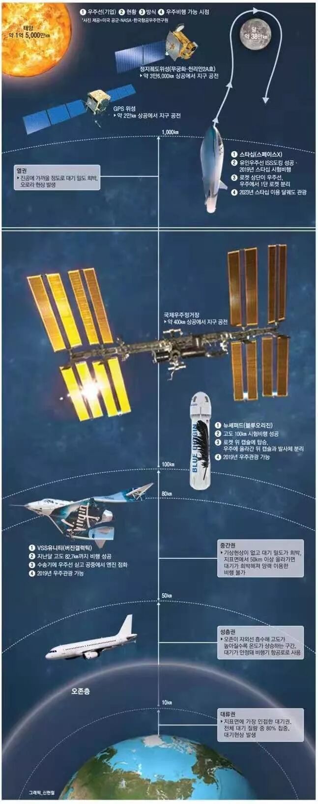 우주의 정의가 필요하다. 국제항공연맹(FAI)은 고도 100km인 `카르만 라인`을 넘어야 우주라고 정의한다. 반면 NASA와 미국 공군은 80km 이상 오른 조종사에게 우주비행사로 인정하는 뱃지를 준다. 2018년 12월 미국 캘리포니아 모하비 사막에서 커다란 수송기가 이륙했다. 수송기 아래에는 우주비행사 2명이 탑승한 버진갤럭틱의 우주선 `VSS유니티`가 탑재돼 있었다. 고도 15km 지점에서 수송기와 분리된 VSS유니티는 로켓엔진을 가동해 마하 2.9 속도로 상공 82.7km까지 올라갔다. NASA와 미국 공군이 설정한 우주의 경계 80km를 뛰어넘어 우주에 다녀온 셈이다. 또한 버진갤럭틱은 올해 2월22일 조종사 2명과 승객 1명을 태운 VSS유니티는 수송비행선에서 분리된 이후 마하3(시속3672km)의 속도로 90km 상공에 도달한 뒤 1분간 우주를 향해 날아간 뒤 몇 분간의 무중력 상태를 경험하고 지상으로 귀환하여 우주여행을 성공시켰다. 버진갤럭틱은 1인당 2억~3억원을 내면 80~100km 우주 상공에 올라 90여 분간 지구를 내려다볼 수 있는 우주관광 패키지 프로그램을 구상하고 있다. 버진갤럭틱은 현재 우주여행 예약자가 700여 명에 달한다고 밝히고 있다. 그러나 올해 안에 우주관광 사업을 본격화하겠다고 했지만 아직까지 우주관광을 마치고 돌아온 여행객은 나타나지 않고 있다. 재사용 로켓으로 고도 100km에 캡슐을 띄워 자유낙하하게 하는 미국 블루오리진의 `뉴세퍼드`도 시험비행에 성공하고 올해 안에 우주관광이 가능하다고 했으나 아직 본격적인 우주관광이 시작 됐다는 소식은 없다. 승객 8~9명을 태운 우주왕복선 `스타십`으로 달을 한바퀴 돌아오는 스페이스X의 민간 달 여행 프로젝트도 진행하고 있는데 2023년으로 예정돼 있다. 러시아 코스모코스는 2025년 출시를 목표로 승객 6명을 상공 180~200km에 띄우는 우주여행 상품을 개발하고 있다.