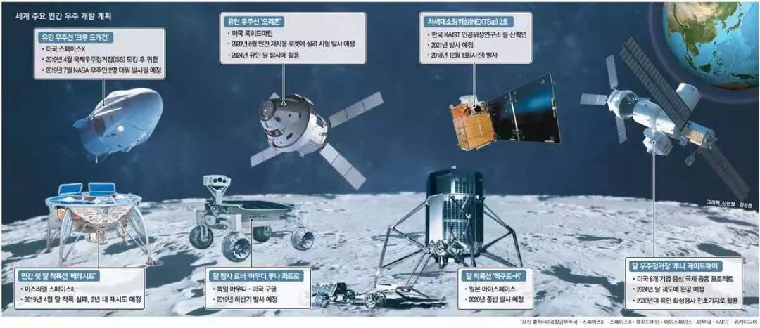 뉴 스페이스(New Space) 시대라 함은 민간 주도의 우주개발 시대를 말한다. ` Small Country, Big Dream (작은 나라, 큰 꿈)` 이스라엘 비영리기업 스페이스IL과 이스라엘 항공우주산업(IAI)이 쏘아 올린 민간 최초의 달 탐사선 `베레시트(히브리어로 창세기)`에 적혀 있던 문구다. 베레시트는 올해 2월 미국 우주개발 기업 스페이스X의 재사용로켓 `팰컨9`에 실려 발사됐다. 달 착륙선 개발에 착수한 지 8년 만이다. 베레시트는 올해 4월12일 달 표면에 착륙을 시도했지만 성공하지 못했다. 그러나 도전 그 자체만으로도 충분한 가치가 있다는 평가다. 민간에서 처음으로 지구에서 38만km 떨어진 달 궤도에 탐사선을 성공적으로 진입시켰고, 비용도 1억 달러 수준으로 초기 수백억 달러에 달했던 정부 주도 달 탐사 임무보다 훨씬 낮았기 때문이다. 스페이스IL은 최근 새로운 베레시트 모델 제작 계획을 확정하고 2년 내 재도전에 나서기로 했다. 작년 11월 미국항공우주국(NASA)은 새로운 달 탐사 경쟁에 나설 민간기업 9곳을 선정해 발표했다. 이 중에 록히드마틴을 제외하고는 달 택배 서비스라는 흥미로운 사업을 준비하고 있는 애스트로보틱테크놀로지스, 우주용 카메라를 제작하는 딥스페이스시스템스(DSS), 소형탑재체를 개발하는 파이어플라이에어로스페이스, 달 자원을 탐사하는 문익스프레스 등 스타트업 벤처들이 이름을 올렸다. 달 탐사선 첫 발사 임무는 올해 안에 이루어 질 계획이다. 뉴스페이스 시대는 사실상 재사용 발사체 개발로 널리 알려진 스페이스X가 주도했다고 해도 과언이 아니다. 팰컨9과 팰컨헤비의 회당 발사 비용은 각각 6200만달러와 9000만달러로 동급 발사체 대비 10분의1 수준이다. 스페이스X가 자체 개발한 `크루 드래건`은 지난 4월 민간 유인 우주왕복선 가운데 최초로 국제우주정거장(ISS)에 도킹한 뒤 지구로 무사히 귀환했다. 보잉사도 올해 8월 유인 우주선 `스타라이너`를 무인 시험비행한 뒤 연말께 우주인을 태울 계획이다. 일본 우주 개발 스타트업인 아이스페이스(하쿠토)는 달 자원 탐사를 목표로 착륙선을 개발하고 있다. 독일 자동차업체 아우디는 구글과 함께 달 탐사 로버(탐사 차) `아우디 루나 콰트로`를 개발해 올해 말까지 달에 보낼 예정이다. 올해 4월 초 일본 자동차업체 도요타도 자율주행 로버를 개발해 일본항공우주개발(JAXA)의 2030년대 달 착륙 프로젝트에 참여하겠다고 밝혔다.