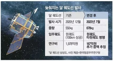 한국의 달 궤도선 상상도와 늦춰지는달 궤도선 발사 계획안